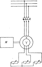 Схема регулирования скорости вращения асинхронных двигателей с фазным ротором при помощи реостата в цепи ротора не отличается от схемы пуска, изображенной на рисунке 2.7, а.