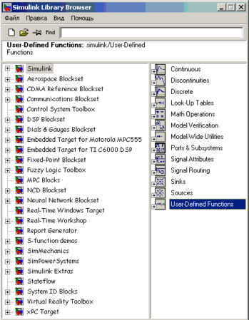 Библиотека блоков Simulink (рисунок 4.1) – это набор визуальных объектов, при использовании которых, соединяя отдельные блоки между собой линиями связей, можно составлять функциональную блок-схему любого устройства.