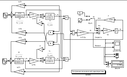 По системе уравнений (4.2) собирается схема модели обобщённой машины в неподвижной системе координат (рисунок 4.5) с рассчитанными параметрами. На входы модели подаются напряжения, сдвинутые по фазе на 90 электрических градусов: