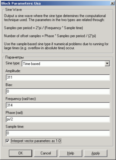 Блоки Usα и Usβ (рисунок 4.6) являются генераторами гармонических сигналов, Usα – косинусоиды, Usβ – синусоиды. Они имитируют работу источников напряжения.