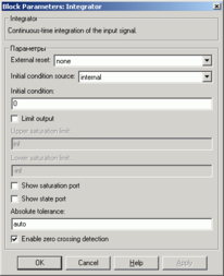 Блок Integrator (рисунок 4.14) представляет идеальное интегрирующее звено. Он позволяет осуществить интегрирование поступающего на него сигнала в непрерывном времени.