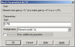 (рисунок 4.7) осуществляет умножение входного сигнала на постоянную величину, значение которой задаётся в настройке блока.