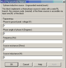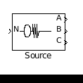 Источник трёхфазного напряжения Source (рисунок 5.2) имитирует работу трёхфазного источника синусоидального напряжения с заземлённой нейтралью N и выходами фаз А, В и С.