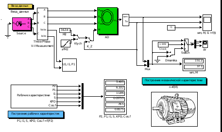 Основными блоками схемы являются: источник трёхфазного напряжения (Source), трёхфазный измеритель напряжения и тока (Three-Phase V-I Measurement), трёхфазный асинхронный двигатель с короткозамкнутым ротором (AD), задатчик нагрузки (М2 и α•М2), измеритель (вывод) скорости и электромагнитного момента на валу (wm, Te).