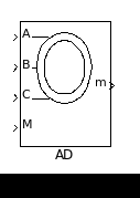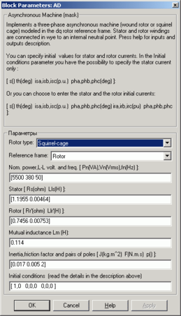 Трёхфазный асинхронный двигатель с короткозамкнутым ротором AD (рисунок 5.4) имитирует работу асинхронного двигателя с короткозамкнутым (или фазным) ротором. Составлен на основе математических уравнений.