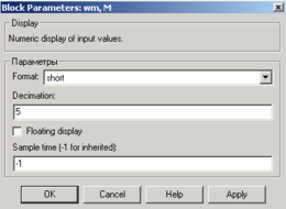 Цифровой дисплей «wm, M» (рисунок 4.17) выводит на экран числовые значения входящих в блок величин (скорости и момента).