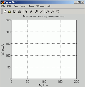 Блок «Построение механической характеристики» (рисунок 4.19) является ссылкой на специально разработанную M-программу, в которой реализуется графическое построение механической характеристики. Большим удобством является то, что имеется сетка и можно наносить надписи осей и в графической области, а также редактирование полученных результатов.
