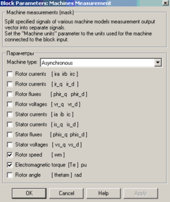 Измеритель (вывод) «wm, Te» (рисунок 5.6) выводит для отображения различные параметры асинхронной машины. Имеет возможность выбрать необходимые для вывода параметры из имеющихся. В данной схеме выводятся значения угловой скорости и электромагнитного момента на валу.
