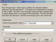 Управляемый ключ Switch (рисунок 5.8) служит для управляемого переключения входного сигнала. Имеет три входа, 1 и 3 - информационные, 2 - управляющий. Если величина управляющего сигнала не меньше некоторого ограничения, заданного в поле Threshold, то на выход подаётся сигнал с первого входа, в противном случае – сигнал с третьего входа. В схеме на первый вход подаётся вектор значений скорости и момента, также и на третий вход подаётся вектор скорости и момента при условии, что ключ Dinamika в верхнем положении, а на второй вход время.