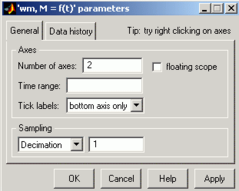Sampling – используется только для дискретных во времени процессов. Его значение (1), установленное по умолчанию, для непрерывных процессов изменять не рекомендуется. Позволяет задать периодичность (через сколько дискретов времени) отображения значений времени.