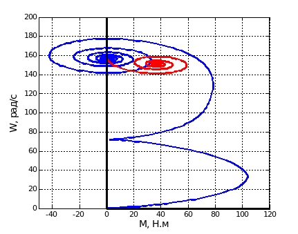 Рисунок 5.16 - Динамическая механическая характеристика при пуске на холостом ходу (синяя) и набросе нагрузки (красная), построенная блоком «Построение механической характеристики»