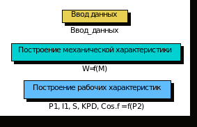 Блоки программ: «Ввод данных», «Построение механической характеристики» и «Построение рабочих характеристик» (рисунок 5.11) – являются ссылками на специально написанные M-программы, в которых реализуется ввод данных с помощью меню (рисунок 5.12) и графическое построение (рисунок 5.13) механической и рабочих характеристик.