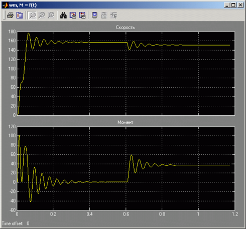 Графический дисплей «wm, M=f(t)» отображает переходной процесс скорости и момента во времени, представленный на рисунке 5.14.