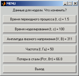 При открытии блока «Ввод данных», в котором реализована подпрограмма “Menu”, на экран выводится меню, в котором можно изменить параметры моделирования. Это является очень удобным элементом, так как ненужно перенастраивать саму модель и её блоки.