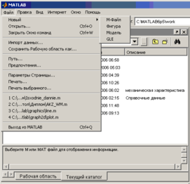 После вызова программы MATLAB 6.5 на экране появляется окно MATLAB. В нём могут отображаться несколько окон, главными являются Окно команд, Текущий каталог и Рабочая область. По необходимости через меню Вид, которое располагается на передней панели, можно настроить окна по собственному желанию.