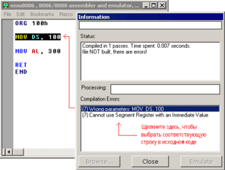 MOV AX, 100 MOV DS, AX MOV AL, 300 - это недопустимая команда, т.к регистр AL имеет только 8 битов, и его максимальное значение 255 (или 11111111b), а минимальное - 128.