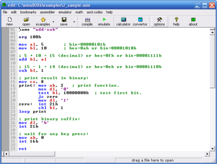 Выполнение всегда начинается с первого байта файла. Этот тип файла уникален для эмулятора Emu8086.