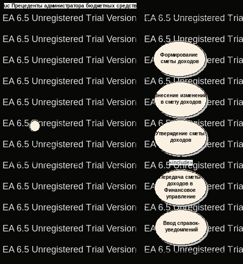 В процессе выполнения прецедента «Передача сметы доходов в Финансовое управление» происходит передача сметы доходов администратора бюджетных средств в Финансовое управление для проверки и окончательного утверждения.