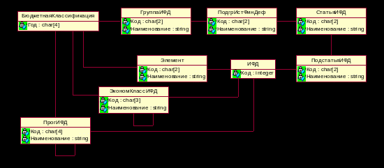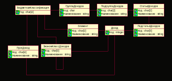 Полная концептуальная модель данных проектируемой системы довольно объемна, поэтому для удобства ее представления в дипломном проекте, она разбита на логические части. На рисунке 2.1 представлена часть концептуальной модели, которая отображает бюджетную классификацию доходов.