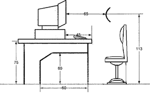 рабочий стол должен иметь пространство для ног не мене 600 мм, шириной не менее 500 мм, глубиной на уровне колен не менее 450 мм и на уровне вытянутых ног не менее 600 мм. Рабочий стул должен быть подъемно-поворотным и регулируемым о высоте и углам наклона сиденья и спинки, а также расстояние спинки от переднего края сиденья;