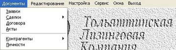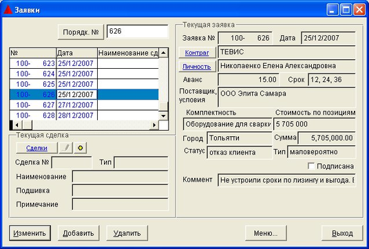 Форма "Заявки". В верхней левой части окна располагается список принятых заявок, упорядоченный по порядковому номеру либо по дате подачи (рисунок 10). Он представляет собой таблицу, содержащую все имеющиеся заявки и их атрибуты. В нижней правой части находится информация о выбранной из списка заявки: данные о личности и контрагенте, которые ее подали, комплектность и стоимость оборудования, а также другая информация по ней. Слева внизу расположена информация о сделке, которая была заключена после принятия положительного решения по данной заявке. В форме существует три кнопки, при нажатии на которые пользователь переходит в другой раздел, связанный с данной записью: "Сделка", "Контрагент", "Личность". Также здесь расположены кнопки, которые находятся во всех, рассмотренных ниже формах: "Изменить", "Добавить", "Удалить", "Выход" и "Меню". Первые четыре кнопки не нуждаются в пояснении, а при нажатии на кнопку "Меню" мы попадаем на форму выбора отчета.