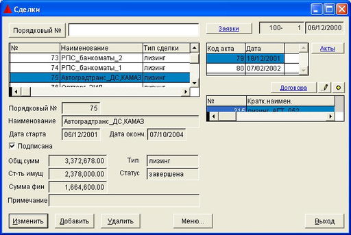 Форма "Сделки". В верхней левой части экрана располагается таблица, содержащая все заключенные сделки и их атрибуты, упорядоченные либо по наименованию, либо по порядковому номеру (рисунок 11). В нижней левой части располагается вся информация по выделенной сделке. В правой части окна находятся данные по заявке, на основании которой была заключена данная сделка, а также информация по договорам и актам, которые совершаются по данной сделке. Здесь находятся три кнопки, по которым можно перейти на другие формы, связанные с данной конкретной записью: "Заявки", "Договора", "Акты".
