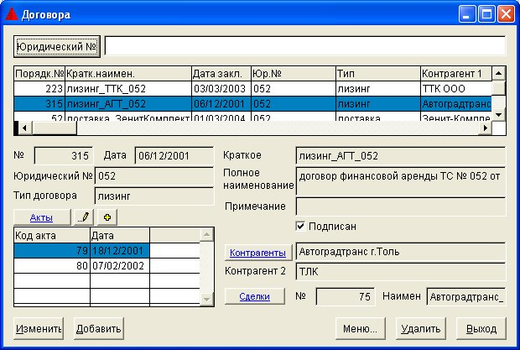Форма "Договора". Центральное место в окне занимает таблица, в которой размещены все договоры, а также их атрибуты (рисунок 12). Список может быть упорядочен тремя вариантами: по юридическому номеру, по краткому наименованию или по дате заключения. Ниже таблицы расположена информация по данному выбранному документу. В самой нижней части окна находится информация о сделке, по которой был заключен договор, о контрагенте, с которым он был заключен и об акте, в случае исполнения договора. Имеются три кнопки, позволяющие пользователю перейти на другие формы, связанные с данной конкретной записью: "Сделки", "Акты", "Контрагенты".