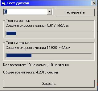 - Тесты съемных и логических дисков работают по принципу создания на тестируемом диске файла определенного объема (для локальных дисков – один мегабайт, для съемных дисков, поскольку они обычно меньшего объема нежели логические – сто килобайт) и вычислении времени, которое ушло на создание данного файла, исходя из которого вычисляется скорость записи данных на диск. Далее уже созданный файл программа считывает и исходя из времени на считывание данного файла высчитывается скорость доступа (чтения) к данным с диска. Эти две процедуры повторяются определенное количество раз (для локальных дисков обе процедуры повторяются по десять раз, а для съемных дисков процедура записи производится один раз а чтение четыре раза) дабы вычислить среднюю скорость чтения и записи и уменьшить погрешность в ходе тестов. При тестах не рекомендуется производить за компьютером других действий (запуск программ, движение мышью), дабы исключить погрешности связанные с работой других программ и устройств, ведь они тоже занимают некоторое время процессора и работают с дисками.