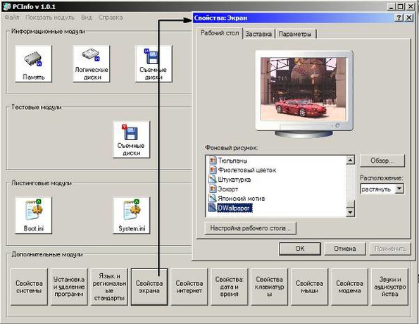 Дополнительные модули – это стандартные диалоговые окна операционной системы Windows, такие как «свойства системы», «установка и удаление программ» и др. Пример того как с помощью дополнительного модуля «Свойства экрана», можно открыть окно «свойства: экран» и установить изображение на рабочий стол и произвести другие настройки показан на рисунке 4.5.
