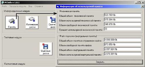 - Память – информация о физической памяти компьютера (полный объем, загруженность памяти и свободное пространство а так же процент используемой памяти) и сведения о файле подкачки (полный объем и др. характеристики);
