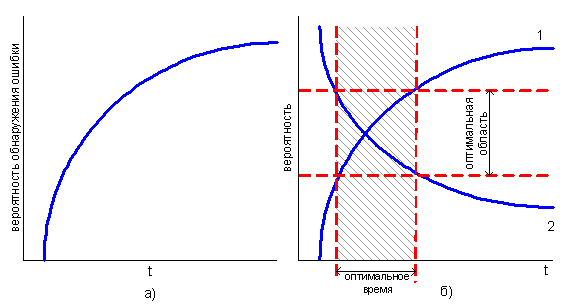 На рис.4а изображена зависимость вероятности обнаружить ошибку от времени, а на рис.4б: линия 1 – зависимость вероятности обнаружить ошибку от времени; линия 2 – вероятность исправить ошибку; также представлены области оптимального соотношения и оптимального времени для обнаружения и исправления ошибок в ЖЦ ПО.