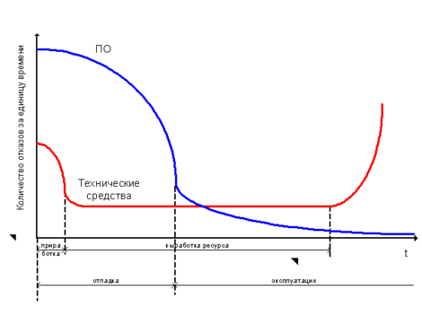 В КИС компьютер, как часть системы, обычно выполняет функции управления и должен работать в режиме реального времени. Поэтому при разработке ПО необходимо учитывать аппаратные средства, средства взаимодействия с пользователем и среду окружения [8]. Поскольку многие свойства ПО сложной системы проявляют себя только тогда, когда она собрана целиком и запущена в рабочий режим, то не учет этих факторов в совокупности может привести к построению ненадежного ПО. График соотношения надежности ПО и аппаратуры показан на рис. 1.