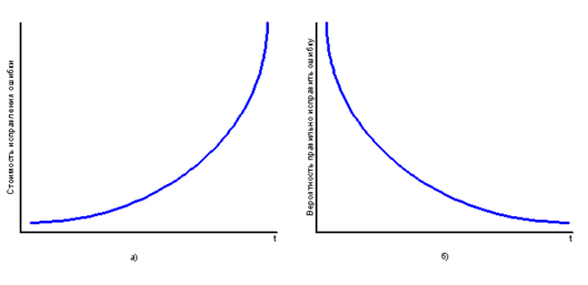 В работе [11] приводится правило "n 1": Проверка правильности фазы n проекта должна осуществляться проектировщиками (исполнителями) фаз (n+1) и (n–1). Кроме того, в [11] приводится обоснование необходимости как можно более раннего обнаружения ошибок проектирования ПО. Оно заключается в том, что стоимость исправления ошибки со временем возрастает (рис. 3б), а вероятность правильно исправить ошибку – падает (рис. 3б).