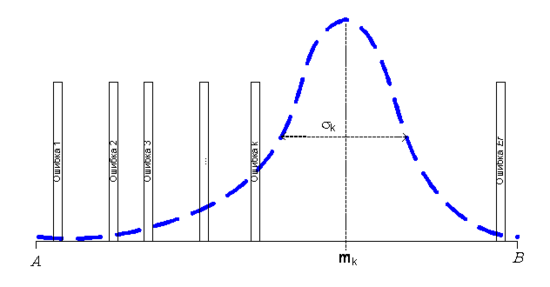 Имеется ПО типа "клиент–сервер". Сервер обслуживает запросы от N программ–клиентов (далее просто клиенты, рис.7). В ПО равномерно по области определения входных данных (ООД) (A, B) расположены Er ошибок.