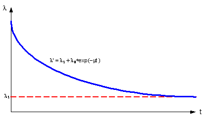 Найдем ` от числа предыдущих исправлений этого модуля. Выскажем предположение, что ` уменьшается с количеством исправленных ошибок до некоторого постоянного значения нечувствительности к исправлениям (например, когда количество исправленных ошибок становится равным количеству вносимых ошибок, или количество ошибок в модуле становится столь малым, что они начинают срабатывать с постоянной интенсивностью) по экспоненциальному закону и стремиться к некоторому минимуму тем быстрее, чем быстрее исправляются ошибки – как показано на рис.15.