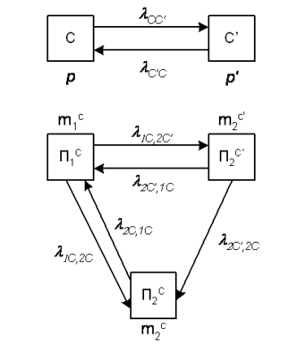 В этом случае для модулей первого типа можно составить дифференциальные уравнения, в которых неизвестными функциями являются вероятности состояний. Для модулей же второго типа – средние численности состояний. Такие уравнения будем называть уравнениями смешанного типа.