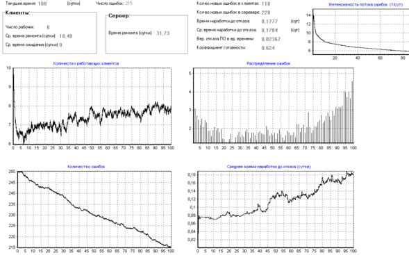 Теперь покажем, что при малой нагрузке на сервер (малом количестве клиентских программ) увеличение количества программистов, исправляющих ошибки, дает малый эффект. Количество неисправленных ошибок к концу тестирования остается таким же. Уменьшается только время ожидания программы исправления в очереди.