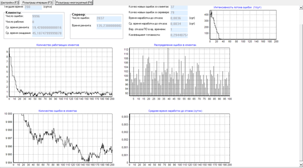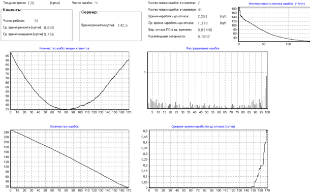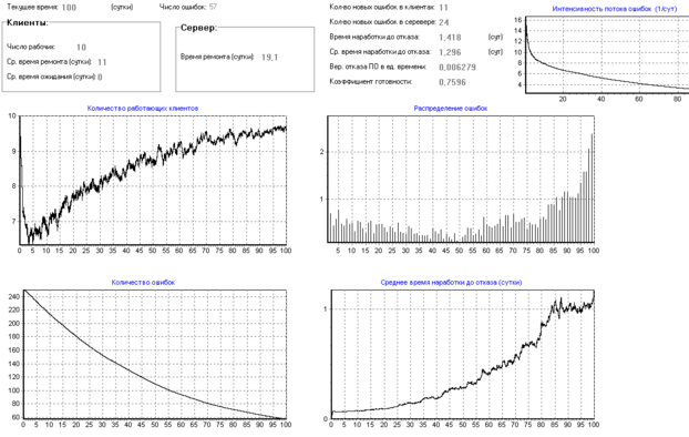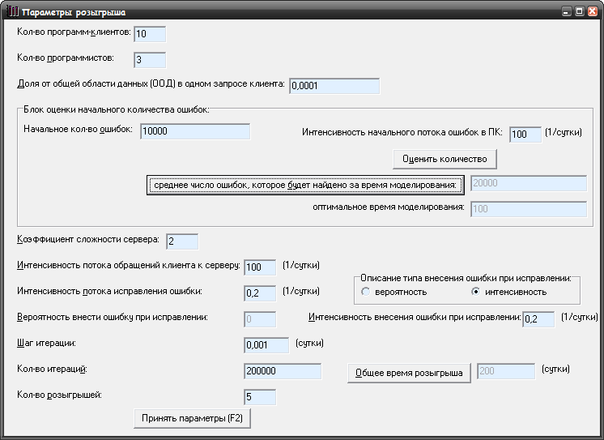 Для решения этой задачи с помощью программы моделирования необходимо добиться того, чтобы начальная интенсивность потока ошибок 0 из модели надежности ПО типа клиент–сервер совпадала с начальной интенсивностью потока ошибок в программе моделирования. Напрямую это сделать невозможно, так как в программе моделирования такого параметра нет. Для этого в программе моделирования нужно положить = 0.5, то есть каждое обращение клиента к серверу и ответ сервера к клиенту должен с вероятностью 1 порождать ошибку. Затем необходимо добиться того, чтобы количество обращений за сутки клиентов к серверу (т.е. K*обр) было равно 0. Остальные начальные параметры программы моделирования необходимо положить равными аналогичным параметрам модели надежности.