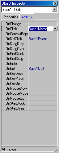 Кроме задания значений свойств, инспектор помогает задавать реакцию на всевозможные события, которые могут происходить в программе – перемещение указателя «мыши», нажатие и отпускание клавиш клавиатуры и т.п. На соответствующей страничке инспектора есть список множества стандартных для компонента (или формы) событий. Каждому событию соответствует своя процедура обработки этого события. Причем одна процедура может обрабатывать несколько событий. Все это указывается с помощью инспектора событий.