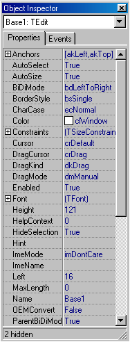 Свойства каждого компонента и формы в целом, а также события, на которые они откликаются, отображаются в окне инспектора объектов (object inspector). Инспектор объектов имеет две страницы – страницу со свойствами и страницу с событиями. Общий вид обеих страниц указан на рис. 2.4: