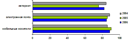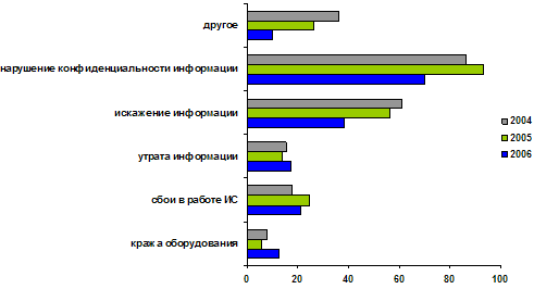 Таким образом, риск утечки ценной информации волнует начальников ИТ-отделов гораздо больше, чем любая другая внутренняя угроза ИБ. Стоит отметить тот факт, что в 2004 и в 2005 году эту угрозу как наиболее опасную отмечали 100% респондентов.