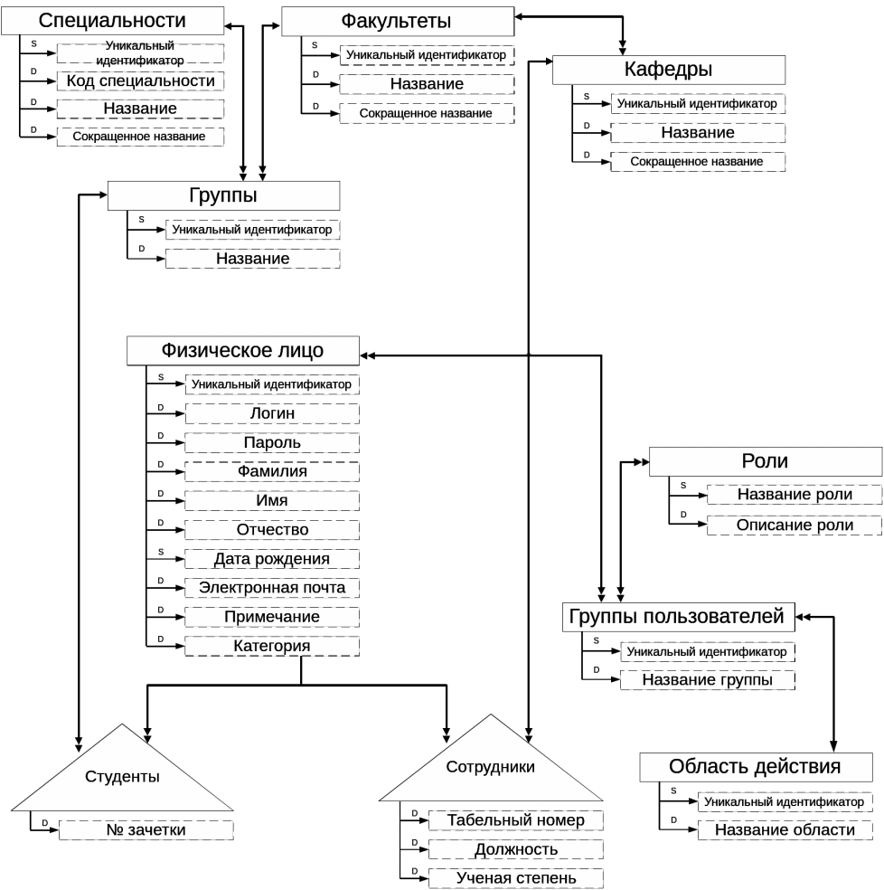 Сотрудники и студенты обладают как общими свойствами, так и характерными только для конкретной сущности.