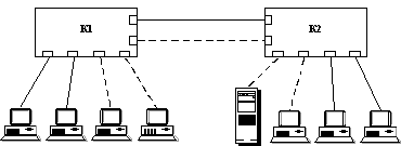 Рис. 1.12. Соединение виртуальных сетей, построенных на группировании портов, через маршрутизатор