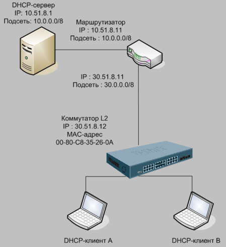 DHCP-сервер использует диапазон адресов 30.51.8.100 - 30.51.8.200 для выдачи DHCP-клиенту, запросы которого перенаправляются агентом DHCP Relay 30.51.8.12 (коммутатор L2)