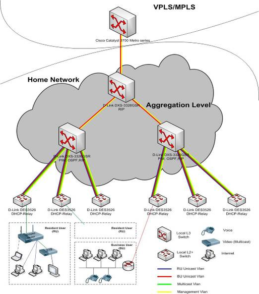 Рассмотрим архитектуру широкополосной сети доступа. Ключевым моментом дизайна сети является трехуровневая модель построения сети. В сети можно выделить оборудование Уровня Доступа (Access Layer) - это свитчи, к которым подключены клиенты, Уровня Распределения (Aggregation Layer) - узловые свитчи (1ый, 2ой уровни и агрегаторы), Уровня Ядра сети (Backbone Layer).