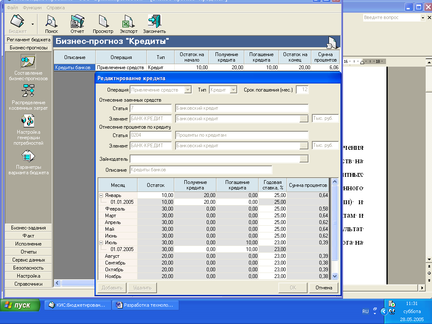 Составляем бизнес-прогноз «Кредиты» (рис. 23), предназначенный для планирования привлечения кредитных ресурсов и расходования финансовых средств на выплату кредитов и погашение процентов. Движение кредитных ресурсов рассчитываем на основании остатка невыплаченного (невозвращенного) кредита, планируемых сумм поступления (выдачи) и погашения кредита, а также планируемой процентной ставки по кредитам и займам.