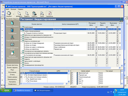 Составляем регламент ввода исходных данных (рис. 13). Регламент бюджетного процесса необходим для организации работ по бюджетному планированию. В регламенте жестко распределяется ответственность центров планирования за конкретные элементы, определяются сроки выполнения заданий. Данная программа позволит автоматически отслеживать эффективность выполнения поставленных в процессе бюджетирования задач посредством сопоставления фактических действий сотрудников предприятия с регламентом бюджетного процесса.
