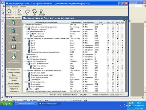 Распределяем полномочия в бюджетном процессе между структурными подразделениями предприятия путем заполнения соответствующей формы (рис 11). Для этого бюджет следует рассматривать как систему организационного взаимодействия центров планирования и центров финансовой ответственности, направленную на составление обоснованных бизнес-прогнозов по функциональным областям деятельности предприятия и дальнейшего получения на их основе бизнес-заданий посредством финансово-хозяйственного моделирования.