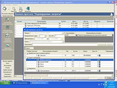 Составляем бизнес-прогноз «Нормируемые затраты» (рис. 21), предназначенный для планирования нормируемых затрат для каждого продукта отдельно по соответствующим статьям затрат в целях расчета общей потребности предприятия на производственную программу и расчета себестоимости продукции. При планировании нормируемых затрат предусмотрена возможность учитывать, что один и тот же продукт может производиться на разном оборудовании и иметь несколько различных рецептур (маршрутов) в зависимости от типа оборудования или используемых компонентов. Рецептуры (маршруты) имеют определенный срок действия и приоритетность использования. Отдельное внимание уделяем величине производственного цикла продукта, так как его производство должно быть обеспечено необходимыми компонентами к началу производственного цикла или на какой-либо его стадии.