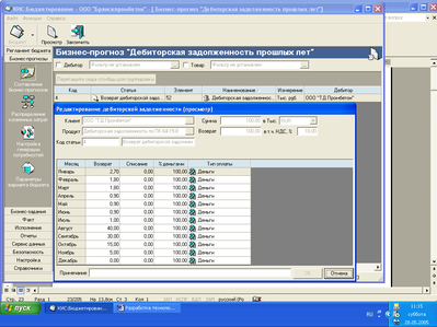 Составляем бизнес-прогноз «Дебиторская задолженность прошлых лет» (рис. 22), предназначенный для планирования поступлений и списаний денежных средств от дебиторской задолженности прошлых лет по конкретным клиентам. Данные формируем на начало планового периода, с указанием общей суммы задолженности (включая НДС) и ее планируемого погашения с учетом вида оплаты (деньги, взаимозачет, векселя).